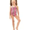 The Billabong Girls’ Aint She A Beaut Ruffle Two Piece Bikini Set (Little Kid, Big Kid) pairs a bold print with a striking silhouette. Made with soft recycled fabric, this girls’ swimsuit features a keyhole at the chest and ties at the neck and back to easily get the perfect fit.